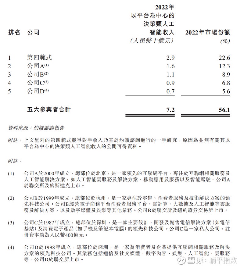 根据公司的招股书,市场前五大参与者中,不难看出排在第四范式之后的四家企业高度疑似百度(HK:09888)、阿里、华为和腾讯。在以平台为中心的决策类 AI 收入方面,第四范式于 2022 年凭借 29 亿元的营收排名首位,五家企业合计市场占有率达到 56.1%,可以说是一个高度集中的市场状态。