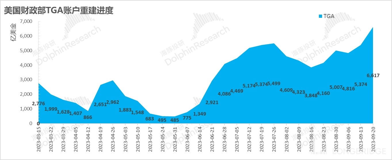 而要注意的是,下半年边际上除了加速到期的中小银行危机贷款工具,财政部 TGA 下一个目标是 12 月底要重建到 7500 亿,仍千亿美金的目标差距。