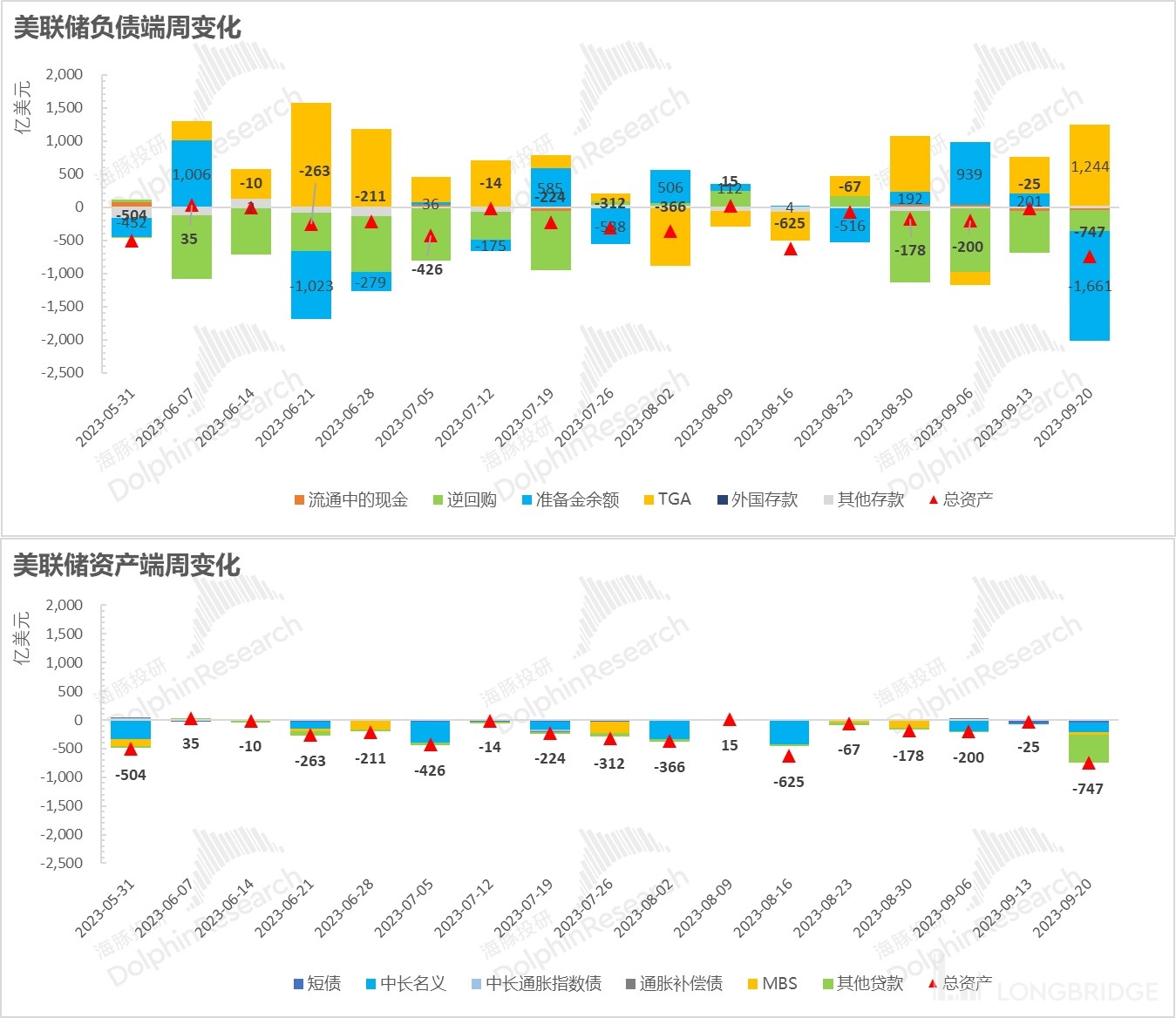 3)由于美联储的资产负债表中,资产=负债,资产在国债抛售和短期贷款工具同步到期的情况下,资产端上周缩水幅度明显超越以往,同时由于负债端上财政部在美联储存款(TGA)的大幅上拉,银行存在美联储的准备金余额已大幅收窄。