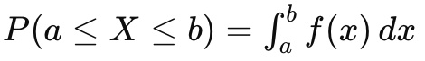 概率密度函數(Probability Density Function, PDF)是描述連續型隨機變量在各個取值點處概率密度的函數。它用於衡量隨機變量在某個特定取值範圍內出現的可能性大小。概率密度函數的特點是其函數值越高,表示隨機變量在該點附近出現的可能性越大。PDF 的積分值在整個定義域上等於 1,表示隨機變量在其取值範圍內的總概率為 1。具體來説,對於連續型隨機變量 X 及其概率密度函數 f(x),在區間 [a,b] 內隨機變量取值的概率可以表示為: