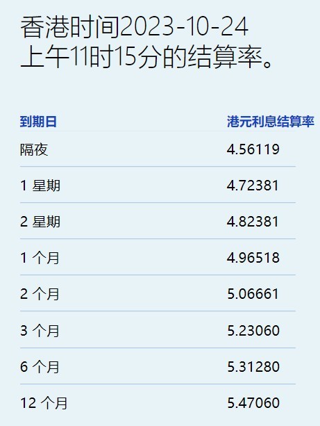 智通財經 APP 獲悉,重陽長假後、施政報告發表前夕,10 月 24 日,港元拆息全線上升,其中,隔夜息升至 4.56119%,而與樓按相關的一個月拆息亦連升兩天報 4.96518%,兩者齊創一週新高。反映銀行資金成本的三個月拆息微升至 5.23060%,見近一週新高,與同期美元 LIBOR 息差收窄至 43 基點。長息方面,六個月期中止兩連跌,報 5.3128%,一年期報 5.4706%。
