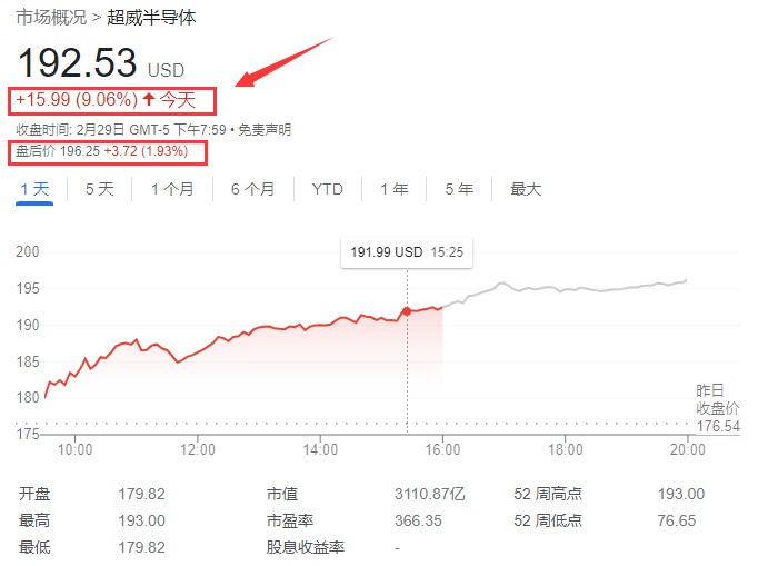 2 月 29 日週四,AMD 股價漲超 9%,使得市值首次突破 3000 億美元大關,達 3110 億美元。在盤後交易中,AMD 的股票進一步上漲 1.93%。