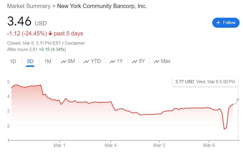 深 V 反彈!地區銀行 NYCB 官宣募資超 10 億,股價跌近 50% 後漲超 30%