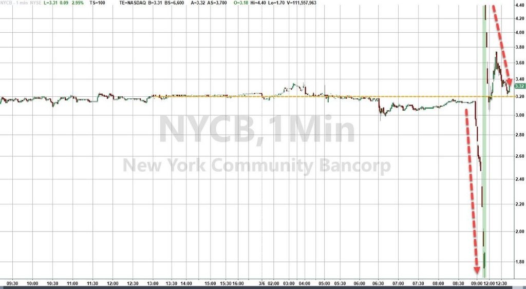 傳出上述消息後,NYCB 股價盤中跳水,日內跌幅迅速從不到 3% 擴大到 40% 以上,刷新日低時日內跌逾 47%,勢將在週二反彈近 19% 後重回上週五暴雷以來的大跌勢頭。盤中 NYCB 至少三次暫停交易。