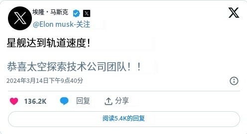 人們紛紛歡呼雀躍,在火箭發射升空後,馬斯克發帖宣佈:“星艦達到了軌道速度!”,美國宇航局(NASA)局長 Bill Nelson 祝賀 SpaceX“試飛成功!”