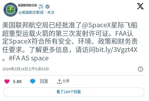 在對這些初期測試進行了仔細評估後,美國聯邦航空管理局(FAA)在週三批准了 SpaceX 進行第三次試射,這是 FAA 對 SpaceX 技術和設計改進的的肯定。