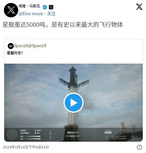 北京時間 3 月 14 日 21 點 25 分左右,馬斯克旗下的 SpaceX(太空探索技術公司)在自家的星艦基地成功發射了 “星艦”,併成功達到了太空,完成了該火箭的第三次關鍵試飛。