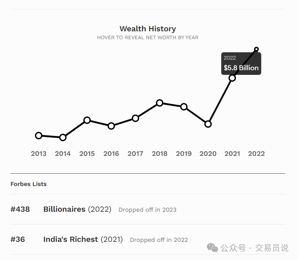 被稱為 “印度巴菲特” 的著名印度億萬富翁交易員拉克什·金君瓦拉(Rakesh Jhunjhunwala)是印度 2022 年第 36 位最富有的人,在世界富豪榜排第 438 位。他從小對股票市場充滿興趣,更是從 5000 盧比交易起步,通過股票交易將資金越滾越大,最終躋身全球富豪榜單。