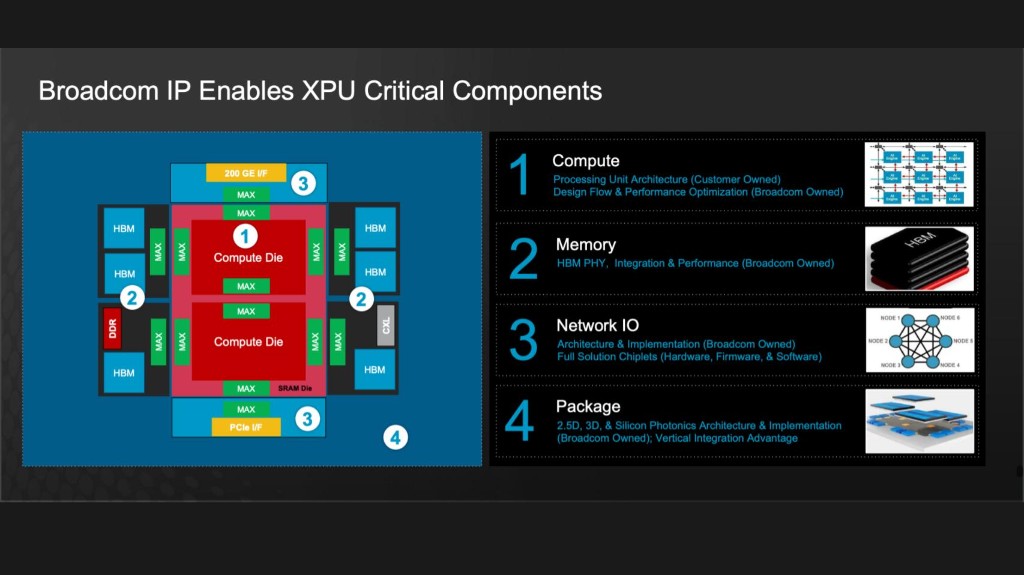 這是一個支撐 AI 工作負載所必需的 “XPU” 基礎架構。圖中右側展示了 Broadcom 的技術,左側對應的數字則體現了它們在系統封裝中的位置。