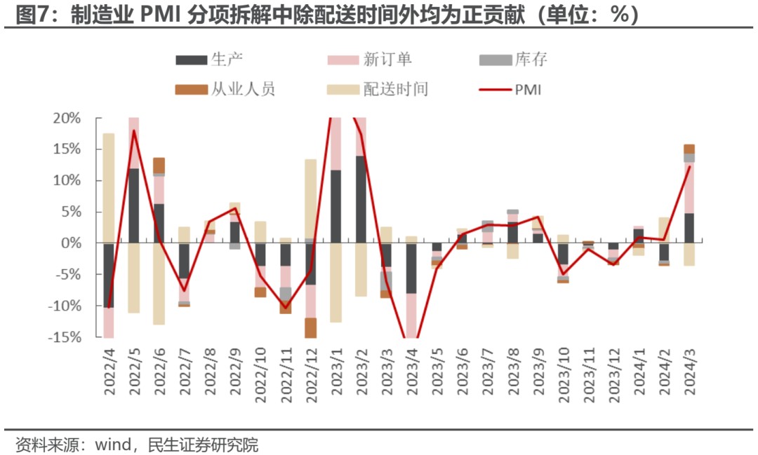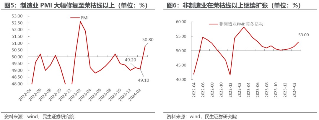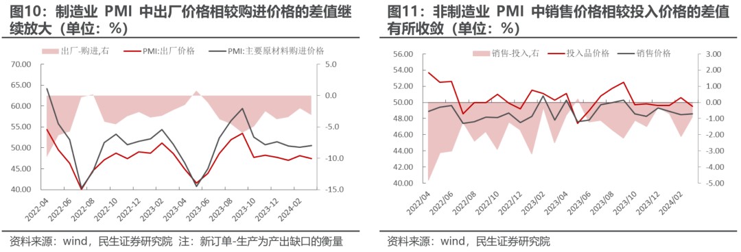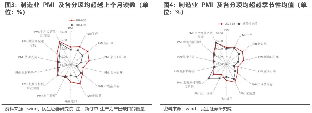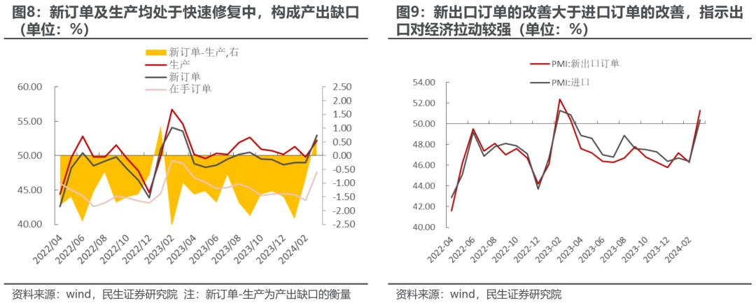 2024年3月份,制造业与非制造业景气均大幅修复,且位于扩张区间。2024年3月份,制造业PMI从2月份的49.1%大幅回升至50.8%,各分项均超越上个月读数和季节性均值;从PMI分项贡献来看,新订单和生产、库存、就业均形成正贡献,且其中新订单的贡献较大,产出缺口自2023年以来首次回正,其中新出口订单读数高于进口分项读数,显示出口景气度较高;非制造业中,建筑业(53.6%→56.2%)及服务业(51.0%→52.4%)均在荣枯线以上继续扩张。但从价格的角度来看,制造业的主要原材料购进价格开始修复,而出厂价格继续萎缩,利润空间继续缩窄,侧面印证了上文中提到的不等式短时间内难以扭转。