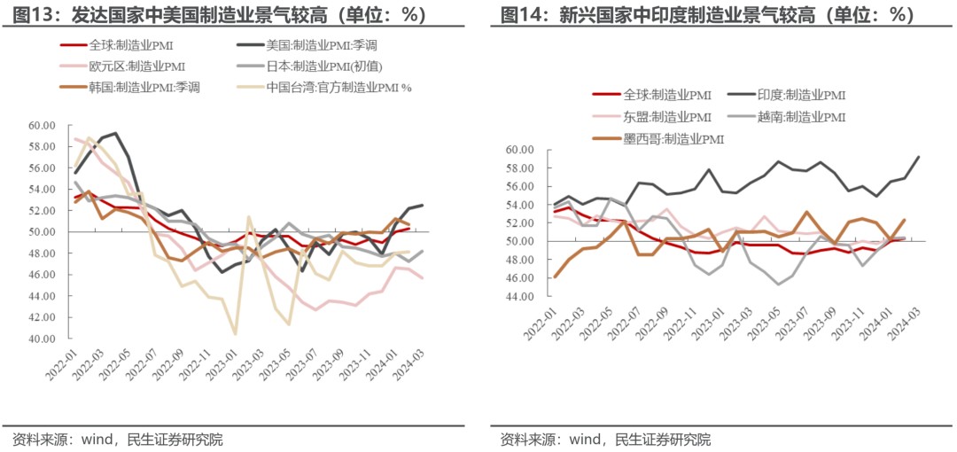 从全球视野来看,进入2023年下半年后,制造业也有修复的迹象,这一迹象进入2024年后更加明显。从PMI的角度衡量,发达经济体中以美国领衔,新兴经济体中以印度领衔,进入2024年后主要的制造业国家PMI大多都恢复到荣枯线以上。