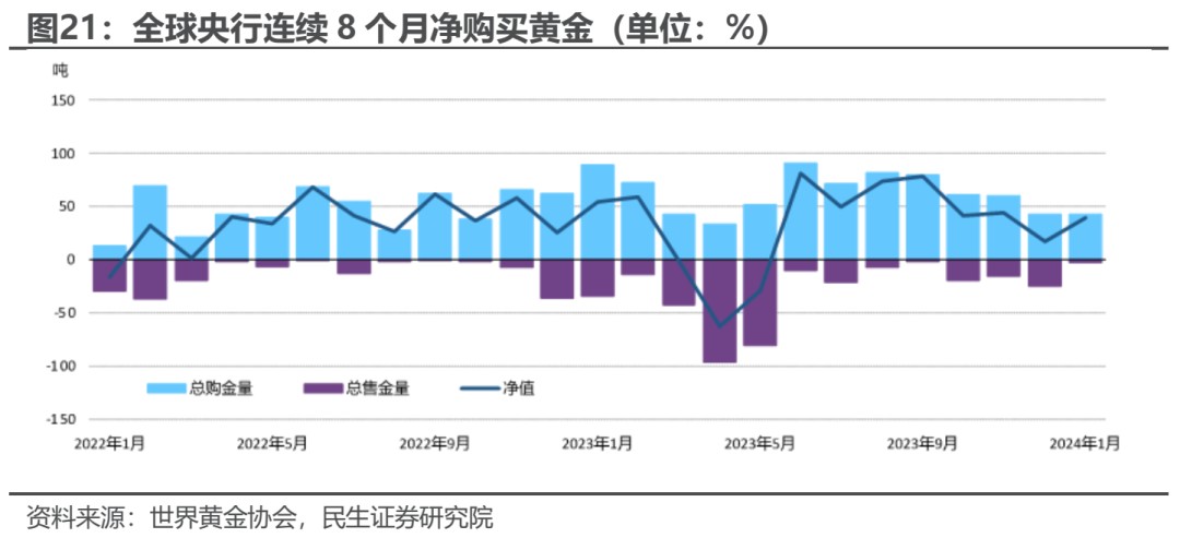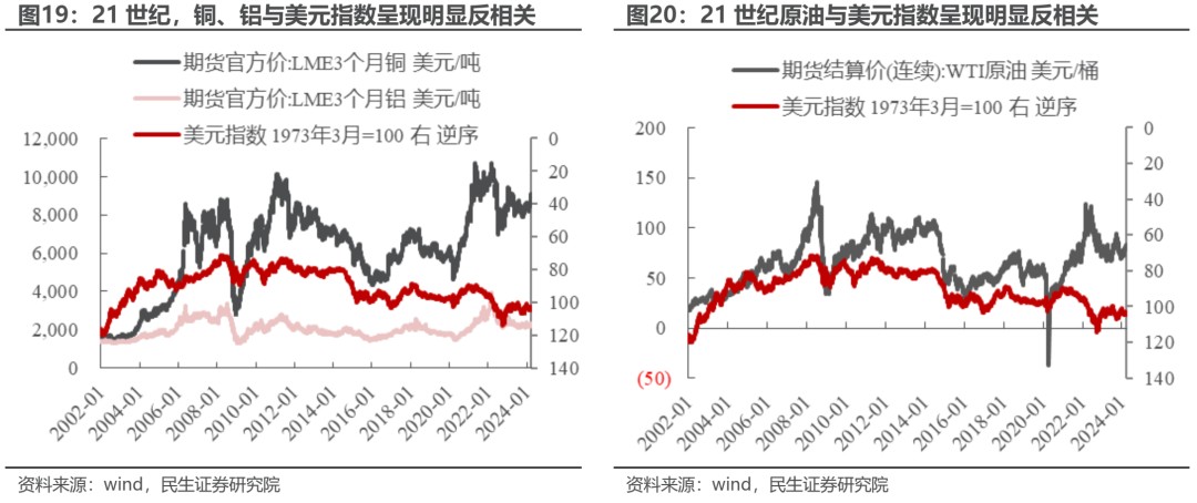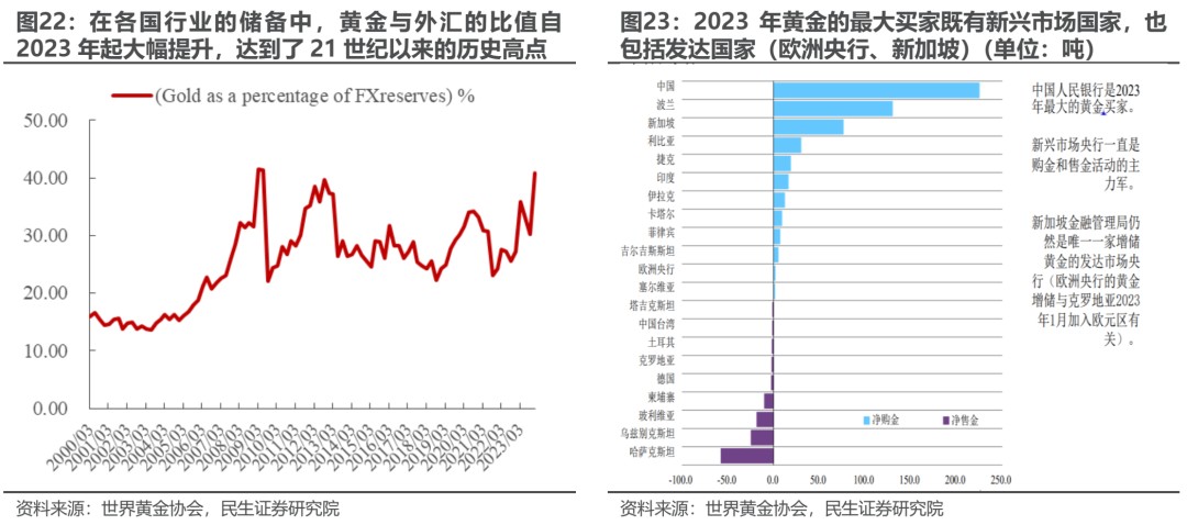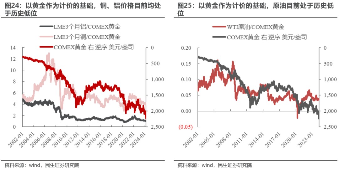 COMEX黄金期货价格在3月29日美国公布备受关注的PCE数据之前抢先上涨至2256.9美元每盎司的历史最高价,在高光不断的黄金之外,近期包括油、铜、铝在内的大宗商品价格均有上涨,而与之相对的则是美元指数相对强势,如何理解这种大宗商品的“金融属性”似乎不再起效?除了全球需求回暖拉动了大宗商品需求之外,我们认为背后或许也反映了信用货币体系在动摇,全球金融资产与实物资产的再平衡已经开始发生。以黄金计价的体系与美元计价的体系或许能说明这一猜想:在21世纪的前20年里,铜、铝、油这几类典型的大宗商品价格与美元指数呈现反相关,而这一关系在2020年后逐渐弱化,“弱化”表现为在美元指数仍然位于20年的历史高位时,铜、铝、油价格却没有跌落至20年的低位,反而处于20年区间的中上水平。黄金天然是货币,当各国央行大幅买入黄金,并提升黄金储备与外汇储备的比值这一事实或许反映了这不是美元与黄金的“比价”,而是信用货币与实物资产的较量,目前后者开始愈来愈占上风。