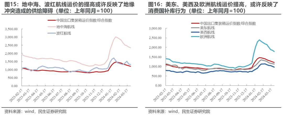 海外制造业PMI的修复,尤其是新兴经济体生产的加快对国内的直接意义在于将拉动中间品和部分消费品的出口。我们从运价和出口数量指数也能够观察到这一传导逻辑:我们在《“外卷”开启,实物崛起》报告中提到新兴经济体在加快生产时,需要向中国进口中间品,尤其是化工类产品和纺服原料,从分行业的出口数量指数中这一关系也得到了印证,从2023年8月以来,化学原料、医药制造、化学纤维、金属及非金属制品等中上游原材料出口数量都大幅正增长。2024年开年以来,中国出口集装箱运价指数大幅提高,除了受到地缘冲突影响的地中海航线、波红航线以外,指向消费国需求的美东、美西、欧洲航线均出现了明显反弹。