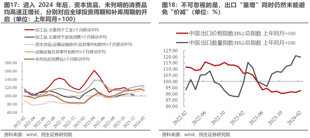 从数量指数来看,值得注意的另一特征是,进入2024年后资本货品开始进入正增长区间、未列明的消费品也继续高速增长。这指向的是生产的修复也促进了全球投资周期的重新开启,中国作为主要的资本品出口国之一和消费品的最大出口国,也受益于全球的投资周期和补库周期。然而,也需要关注价格指数持续下行的压力,“量增而价减”或许是在面临海外竞争对手逐渐增多的环境下的长期情景。