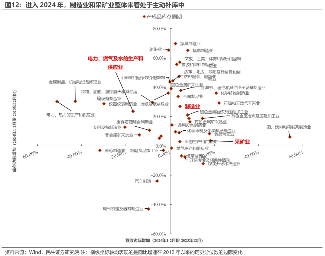 我们在春季策略《江船火独明》中对2024年需求端的驱动力做了两个观察:一方面是全球的补库行为,另一方面则是“逆全球化”下新兴经济体的新建产能和部分成熟国家的“制造业回流”带来的投资行为。目前来看,两者出现了共振的征兆:从中国的库存周期来看,采矿业、制造业均在2024年开年以来处于主动补库的状态中,营收增速回暖的同时,存货同比边际上升。分行业来看,主要是下游消费品和中上游材料、资源处于主动补库中,而公用事业及部分设备制造、医药仍处于被动补库或被动去库中(营收增速边际恶化)。