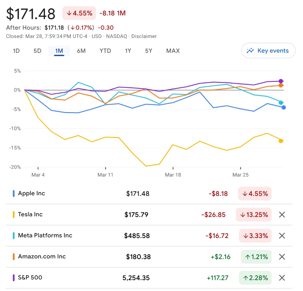 FxPro 高級市場分析師 Alex Kuptsikevich 在一份報告中表示,今年 3 月 “科技七巨頭” 的漲勢受到蘋果和特斯拉下跌的影響,亞馬遜和 Meta 的表現也落後於標普 500 指數。