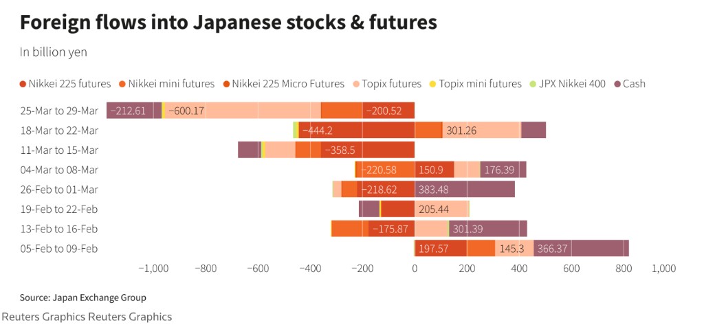 值得注意的是,外資 3 月底淨賣出日本股票現貨和期貨的規模創六個月新高。據日本交易所集團的數據,外國投資者在截至 3 月 29 日的一週淨賣出了 1.18 萬億日元(78 億美元)的股票現貨和期貨,刷新去年 9 月最後一週以來的最高水平。