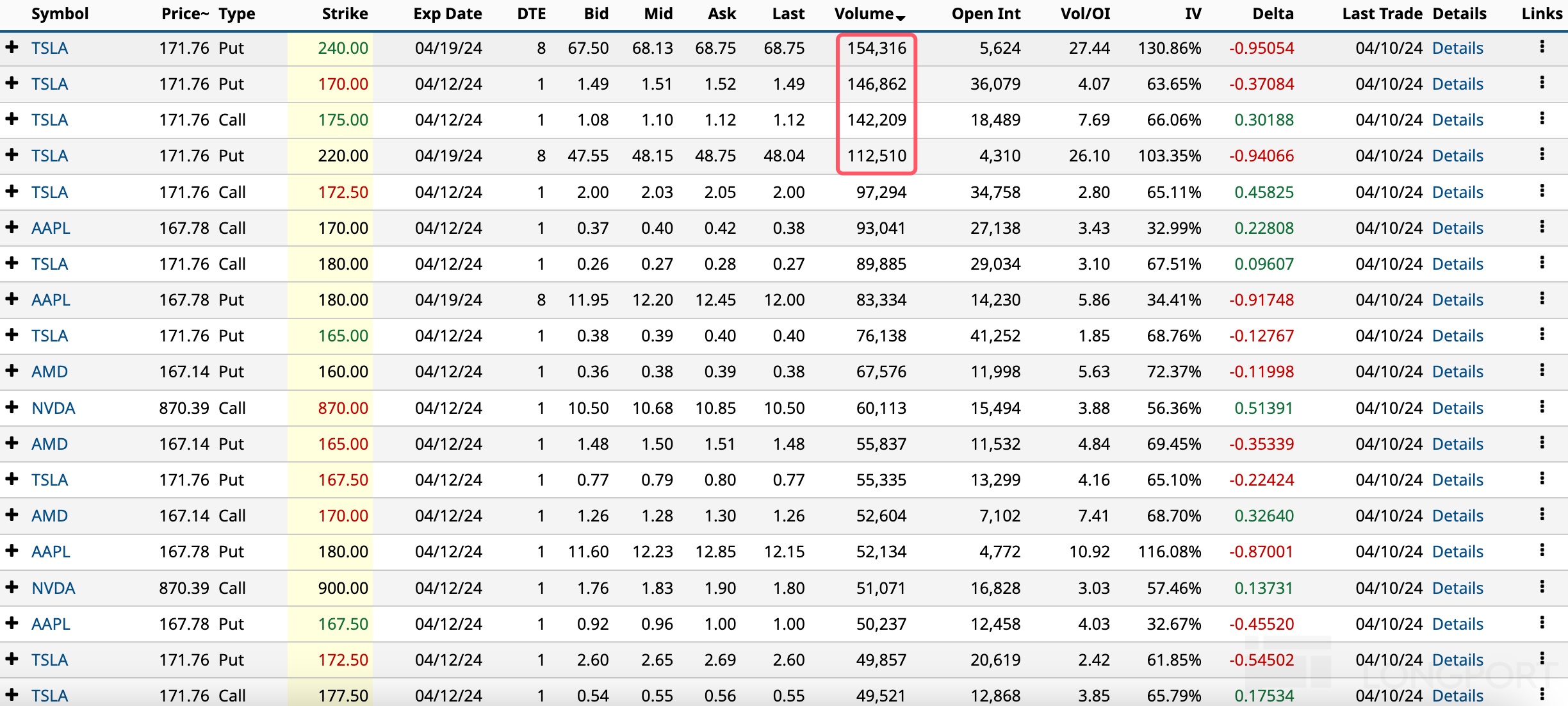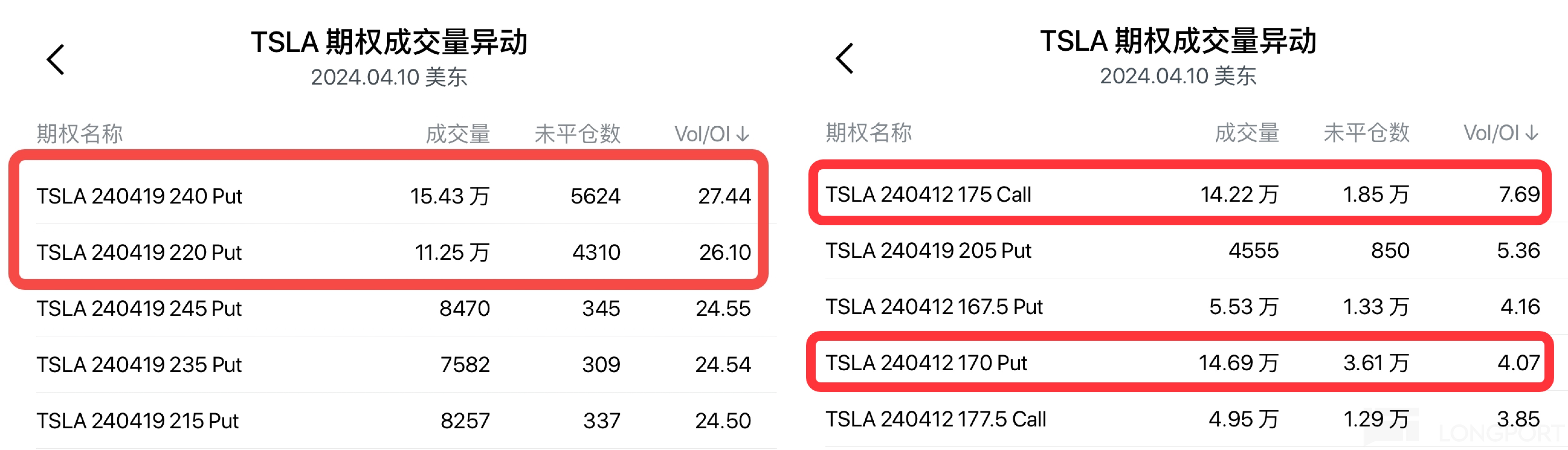 特斯拉跌 3%,期權成交微漲至 192 萬張,看跌期權佔比 55.6%。4 月 19 日到期、執行價 240 美元的看跌期權成交超 15 萬張,執行價 220 美元的看跌期權成交也超 11 萬張;4 月 12 日到期、執行價 170 美元的看跌期權和執行價 175 美元的看漲期權成交均超 14 萬張。