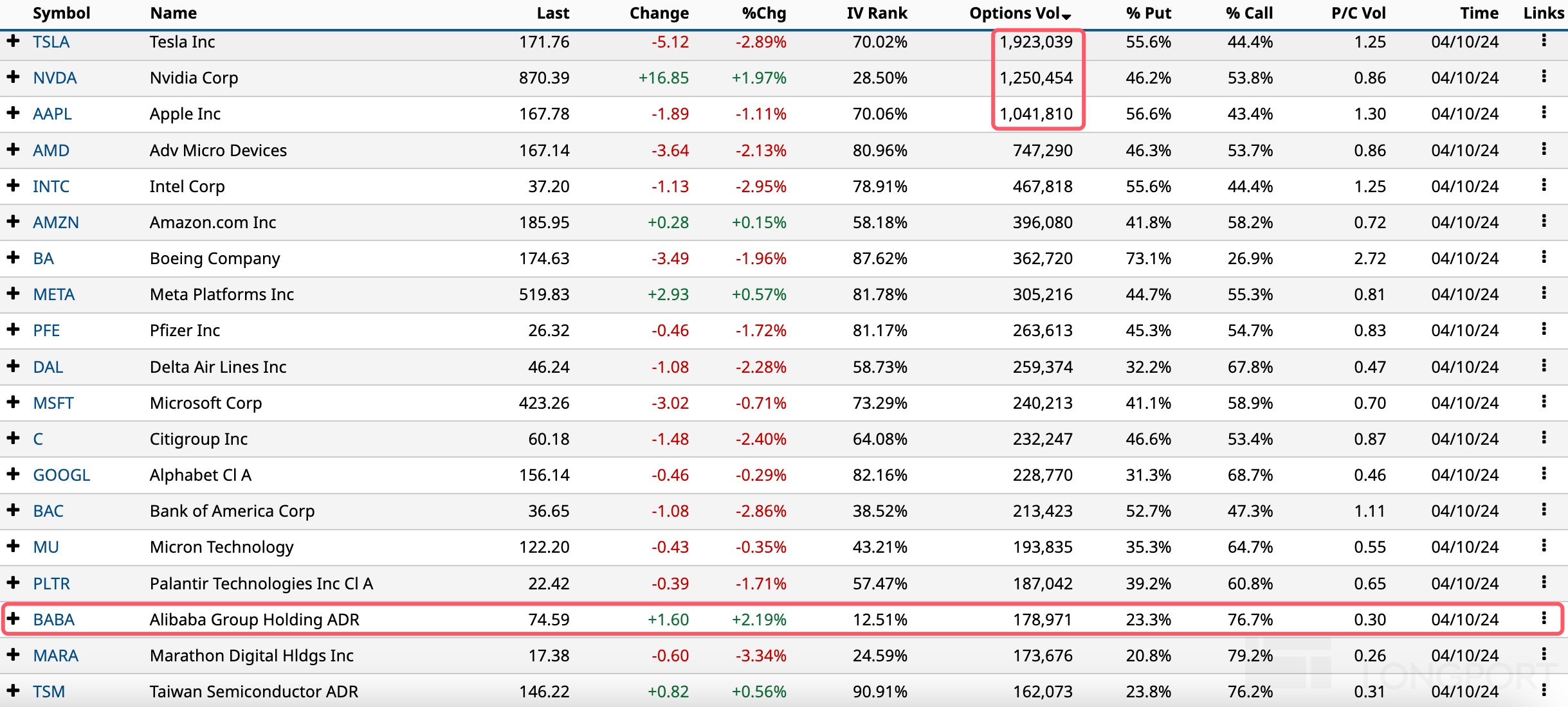 特斯拉期權成交微漲至 192 萬張,看跌期權佔比 55.6%,4 月 19 日到期、執行價 240 美元的看跌期權成交超 15 萬張,為隔夜最火合約。蘋果期權成交幾乎翻倍至 104 萬張,看跌期權佔比 56.6%。