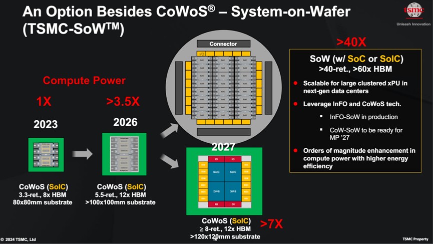 該技術將多個芯片直接在晶圓上互連,更多的是在橫向去擴展芯片系統(見下圖),預計未來封裝後尺寸將達到 12x12cm。