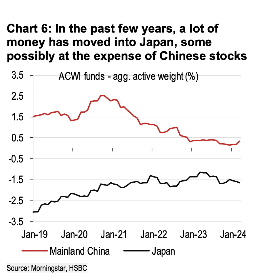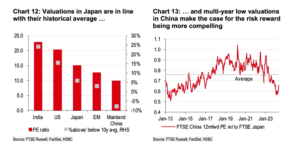滙豐在週二的報告中指出,中國市場情緒有所改善,估值較低和有利的基金倉位使其風險/回報比日股更具吸引力。