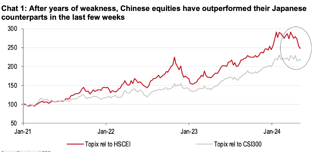 近期港股發起大反攻,中國市場投資吸引力增強,相比之下儘管日元走軟,但日本股市表現逐漸轉弱。