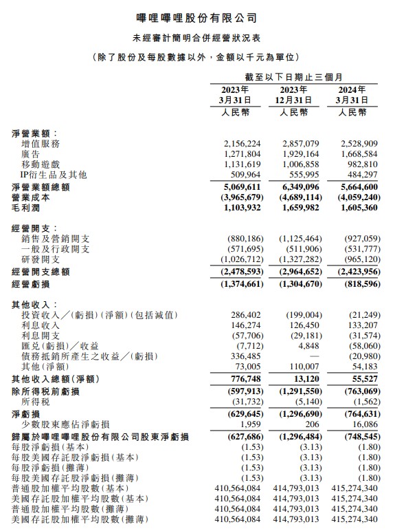 B 站一季度營收同比增加 12%,淨虧損同比增加 21.4% | 財報見聞
