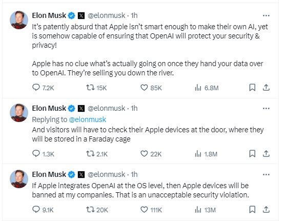馬斯克威脅稱,由於 OpenAI 不尊重用户的數據隱私,若蘋果在操作系統級別整合入 ChatGPT 的功能,他旗下的所有公司將禁止使用蘋果設備,訪客需要把設備存放到法拉第籠中。僅他旗下最大的公司特斯拉在全球僱員便超過 14 萬。