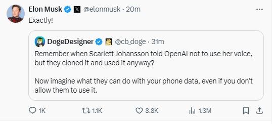 他還轉發了一個網友的帖子稱,好萊塢演員斯嘉麗·約翰遜曾告知 OpenAI 不要使用她的聲音,但後者還是高度模仿並使用,“現在想象一下,即使你不允許他們使用,他們也能用你的手機數據做什麼。” 馬斯克回覆稱 “就是這樣!” 他還稱 OpenAI 是令人毛骨悚然的間諜軟件。