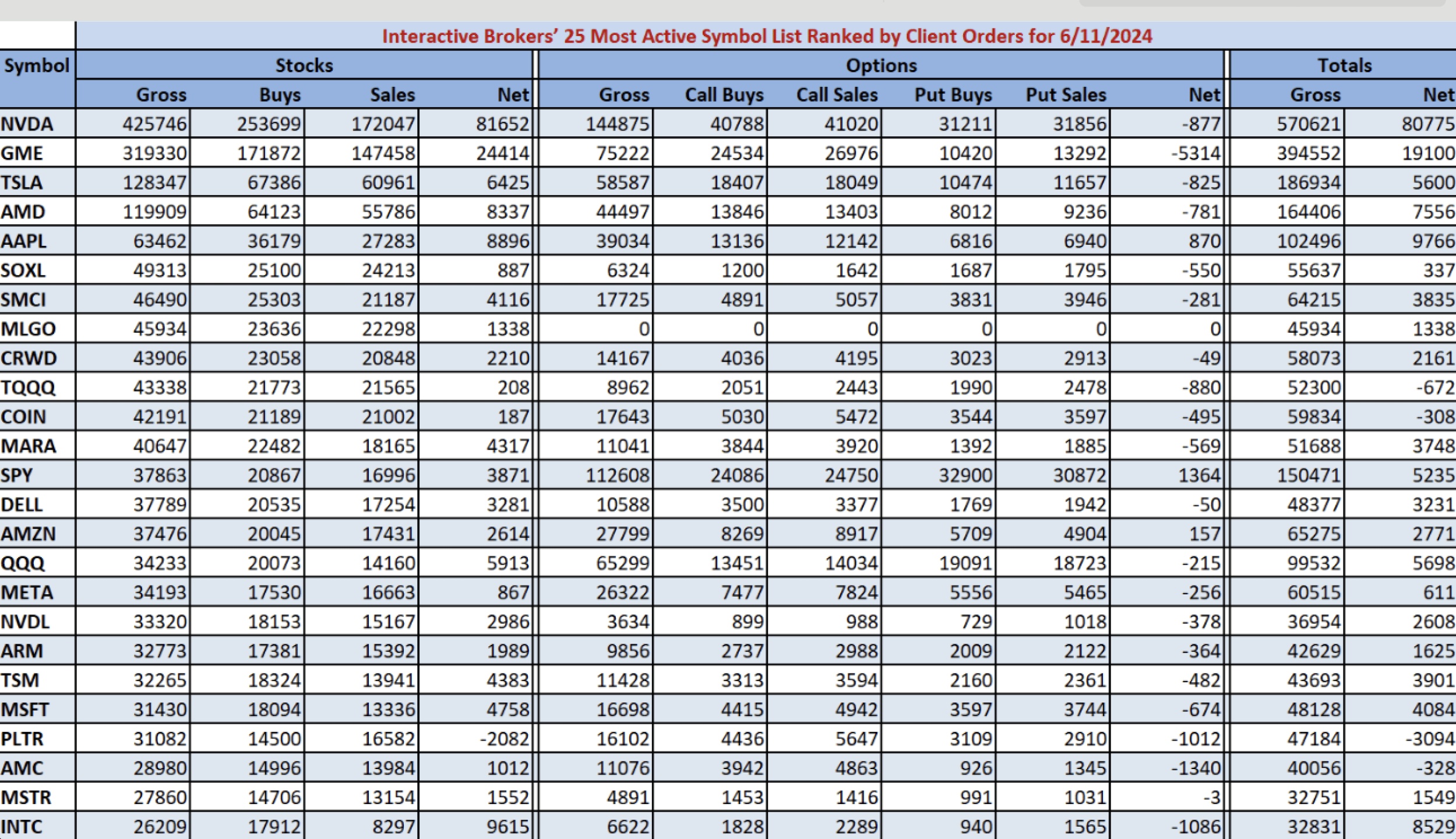 以下是盈透證券所統計的 25 家交易最活躍美股上市公司的完整數據,英偉達毫無爭議地引領美股交易熱度榜: