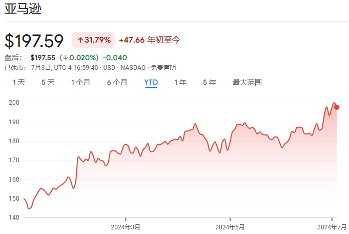 亞馬遜股價在週三股盤中創下 200.43 美元的歷史新高,今年累計上漲超過 30%,跑贏了同期道瓊斯工業指數 4% 的漲幅。