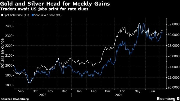 智通財經獲悉,在美國非農就業數據公佈前夕,由於市場預期美聯儲將在年底前降息,金價實現連續周度上漲,投資者正尋找有關美國經濟前景的下一批線索。現貨黃金在本週上漲超過 1% 後,交易價格超過 2360 美元/盎司。銀價也從金價上漲中受益,回升至 31 美元/盎司。截至發稿,現貨黃金上漲 0.2%,至 2360.62 美元/盎司,彭博美元現貨指數和 10 年期美國國債收益率均出現本週下跌。本週白銀上漲了近 5%,鉑金和鈀價格也有所上漲。