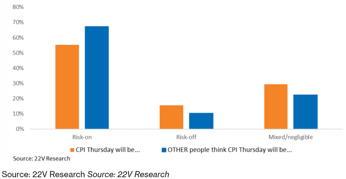 22V Research 所做的調查顯示,55% 的投資者預計市場對週四的 CPI 的反應是 “Risk On”(即 “追逐風險”),16% 的投資者認為是 “Risk Off”(即 “風險規避”),29% 的投資者認為是 “混合/可以忽略不計”。