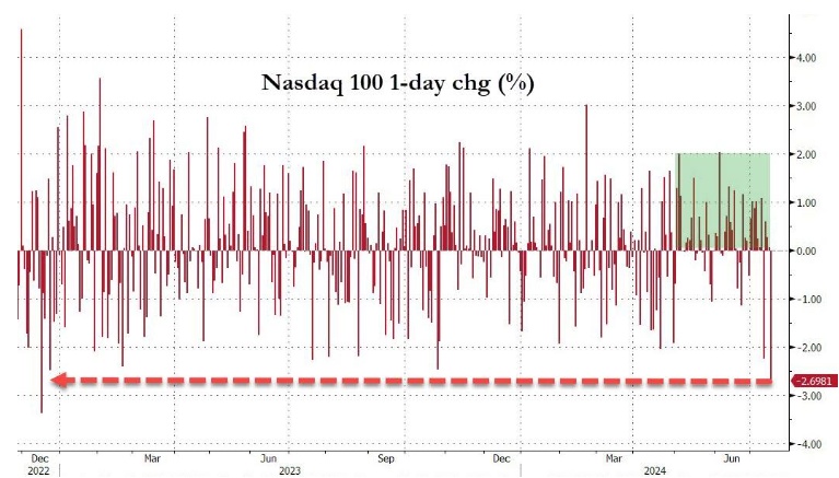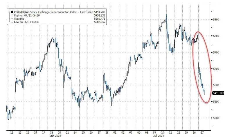 巴克萊銀行全球研究主管 Ajay Rajadhyaksha 表示,週三的芯片股跌勢反映了投資者對地緣政治風險的高度關注,特朗普目前贏得美國大選的可能性大大增加。而且現在美股的風格輪換非常激進,繼續從大盤科技股轉向小盤股。
