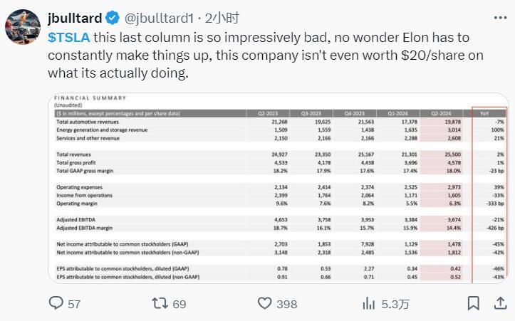 還有網友稱,特斯拉二季度業績總結的圖表裏,最後一列同比的表現實在糟糕,難怪馬斯克總是編造謊言,特斯拉的實際價值甚至還不到每股 20 美元。