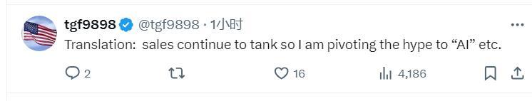網友評論特斯拉總結的汽車和 AI 等領域業績要點稱,翻譯一下,特斯拉告訴我們,銷售繼續大跌,所以我要轉向 AI 等熱門概念了。