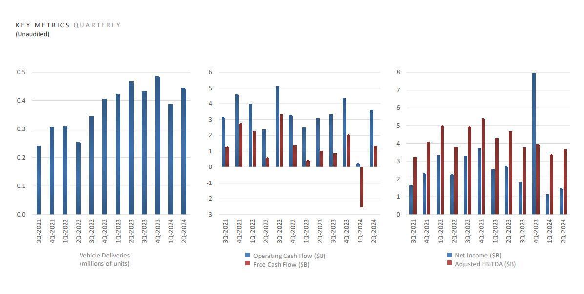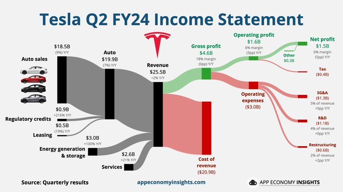 - 二季度營收 255 億美元,同比增長 2%,分析師預期同比降 1.2% 至 246.3 億美元,其中,汽車業務的營收為 198.8 億美元,同比下降 7%,能源發電與儲能業務的營收為 30.14 億美元,同比翻倍增長。