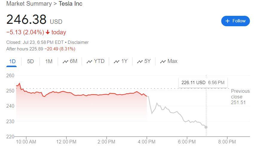 二季度財報公佈後,本週二收跌約 2% 的特斯拉股價盤後加速下跌,盤後跌幅擴大到 4% 以上,電話會上馬斯克講話期間,盤後跌幅進一步擴大,跌超 8%。