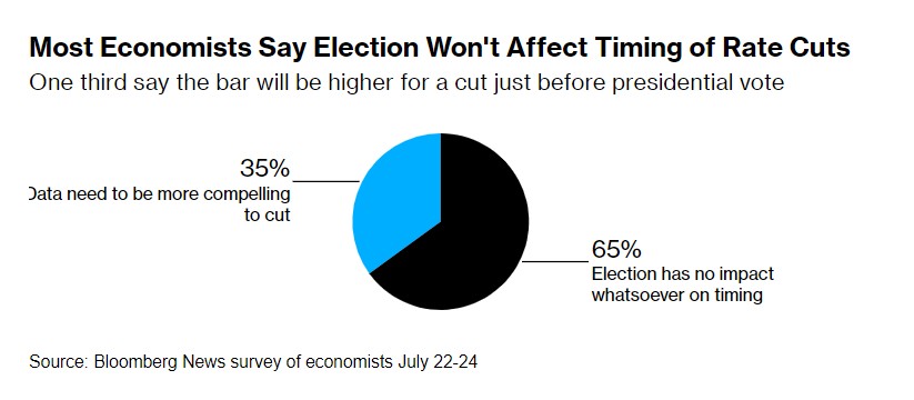 三分之一的經濟學家表示,總統大選將提高降息的門檻,這意味着數據需要逐漸變得更有説服力,但其餘的經濟學家表示,他們同意鮑威爾的觀點,即大選的時間不會對利率政策產生影響。