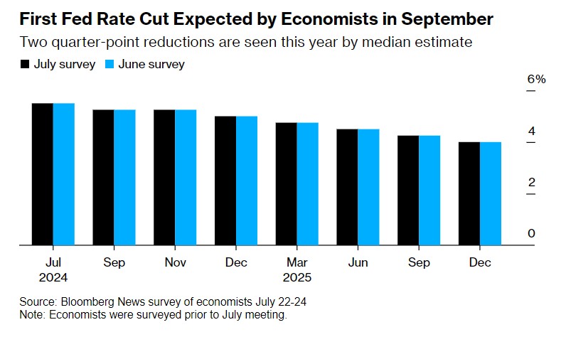 經濟學家預計美聯儲將在 9 月和 12 月各降息 25 個基點,這一預期中值不及市場樂觀,後者認為今年降息 75 個基點的可能性高於五成。