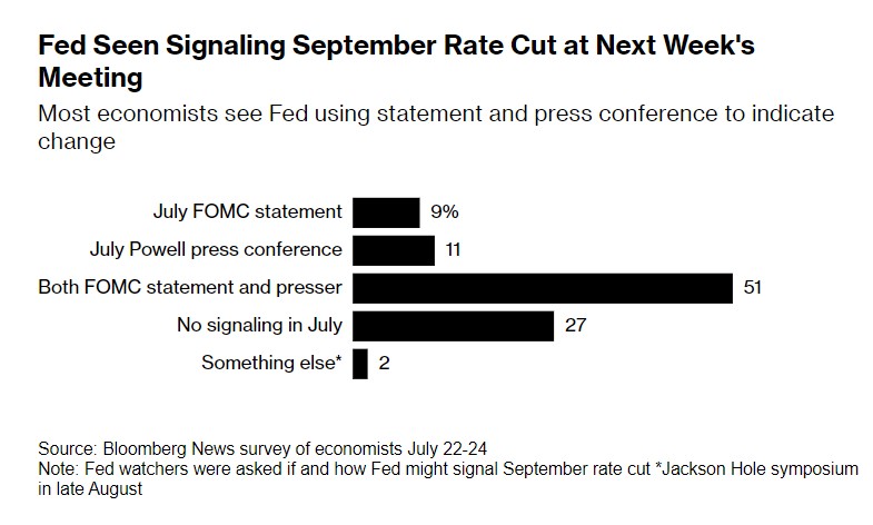 近四分之三的受訪者表示,美聯儲將利用 7 月 30-31 日的會議為在 9 月份的下一次會議上降息 25 個基點鋪路。不過,他們對決策者將如何做存在分歧。