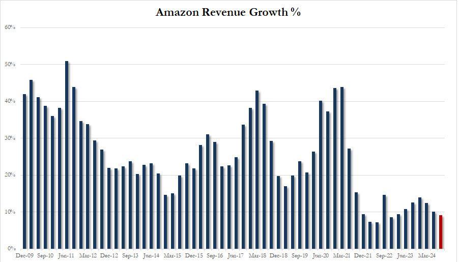 相比二季度業績,三季度的亞馬遜業績指引暴露了更大的問題。以指引區間計算,亞馬遜預計三季度營收將同比增長約 8% 至 11%,均值低於接近指引高端的分析師預期。若這一指引的低端預測無誤,亞馬遜三季度的營收將創 2022 年 12 月以來最低增速。