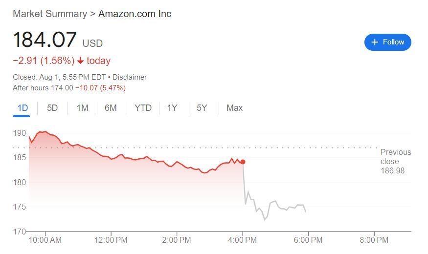 財報公佈後,週三收跌近 1.6% 的亞馬遜股價跌幅迅速擴大,盤後一度跌超 6%。