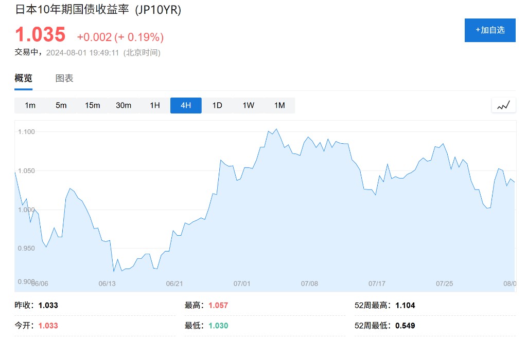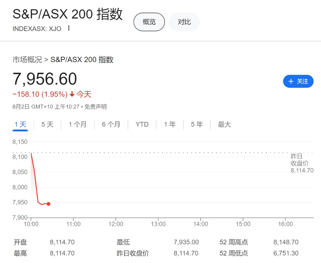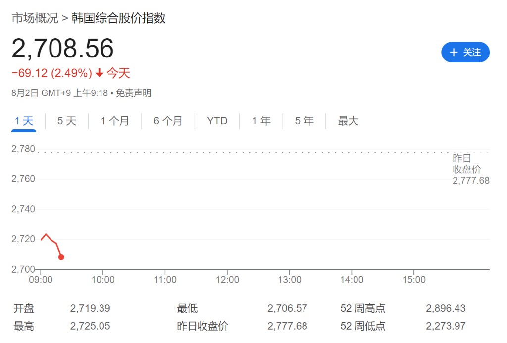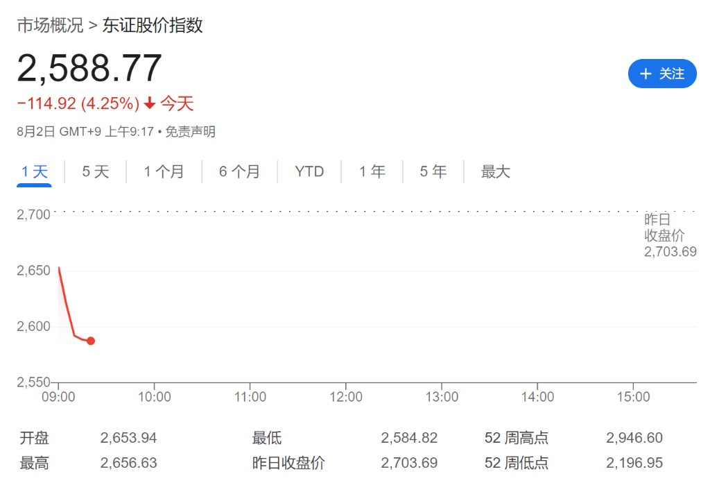 對經濟衰退的擔憂疊加地緣政治局勢緊張,亞太股市追隨美股下跌。日經 225 指數開盤暴跌超 4.3%,東證指數跌逾 4.2%,韓國 KOSPI 指數下跌 2.49%。芯片股重挫,日本 10 年期國債收益率跌破 1%。MSCI 亞太指數跌近 3%,創兩年以來最大跌幅。