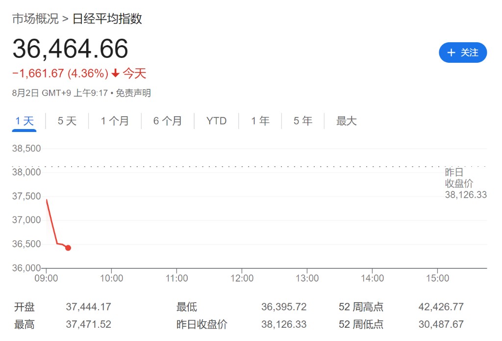 日經 225 指數開盤暴跌超 4.36% 至 36464.66 點。