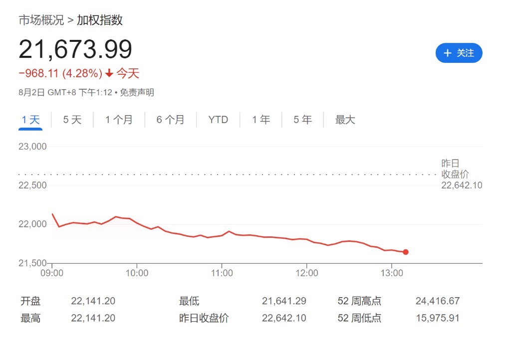 台灣證交所加權股價指數下跌 4.28% 至 21673.99 點。