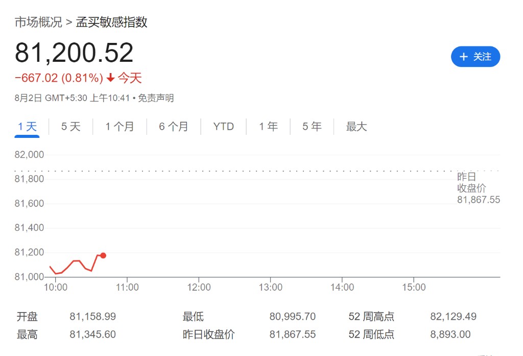 印度 SENSEX 指數跌 1%,現至 81200.52 點。