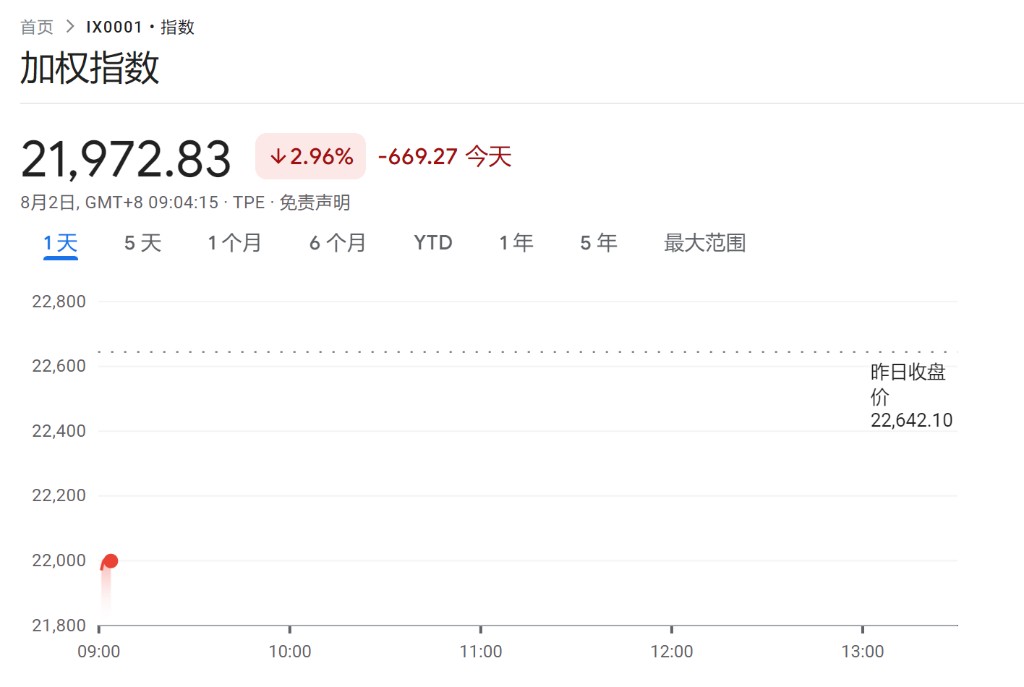 台灣證交所加權股價指數盤初下跌 3% 至 21961.68 點。