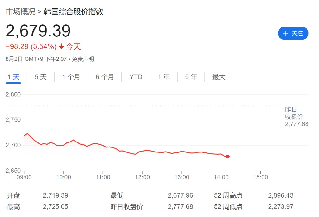 韓國首爾綜指跌幅擴大至 3.6%,創下 6 月初以來最低盤中水平。