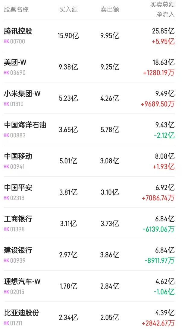 北水淨買入最多的個股是騰訊 (00700)、中國平安 (02318)、小米集團-W(01810)。北水淨賣出最多的個股是工商銀行 (01398)、建設銀行 (00939)、理想汽車-W(02015)。